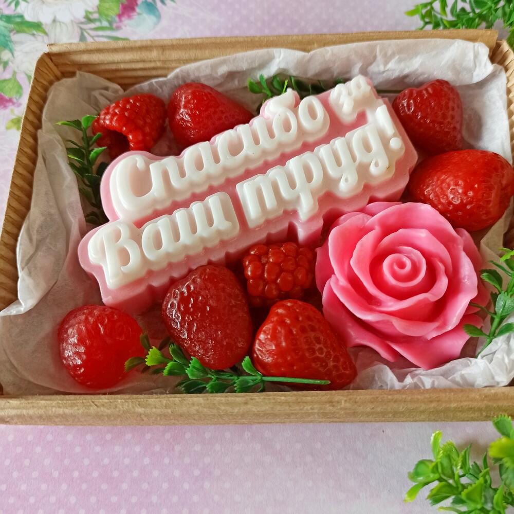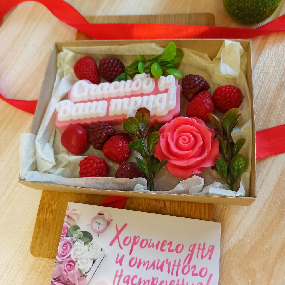 Искусственная зелень – 3 шт.мыло надпись спасибо за ваш труд – 1 шт.Мыло роза – 1 шт.мыльные ягодки – 10 шт.