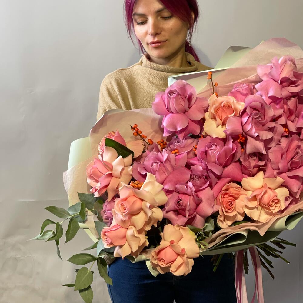 Гвоздики, Кустовые розы, Лизиантусы, Пионовидные розы, Розы