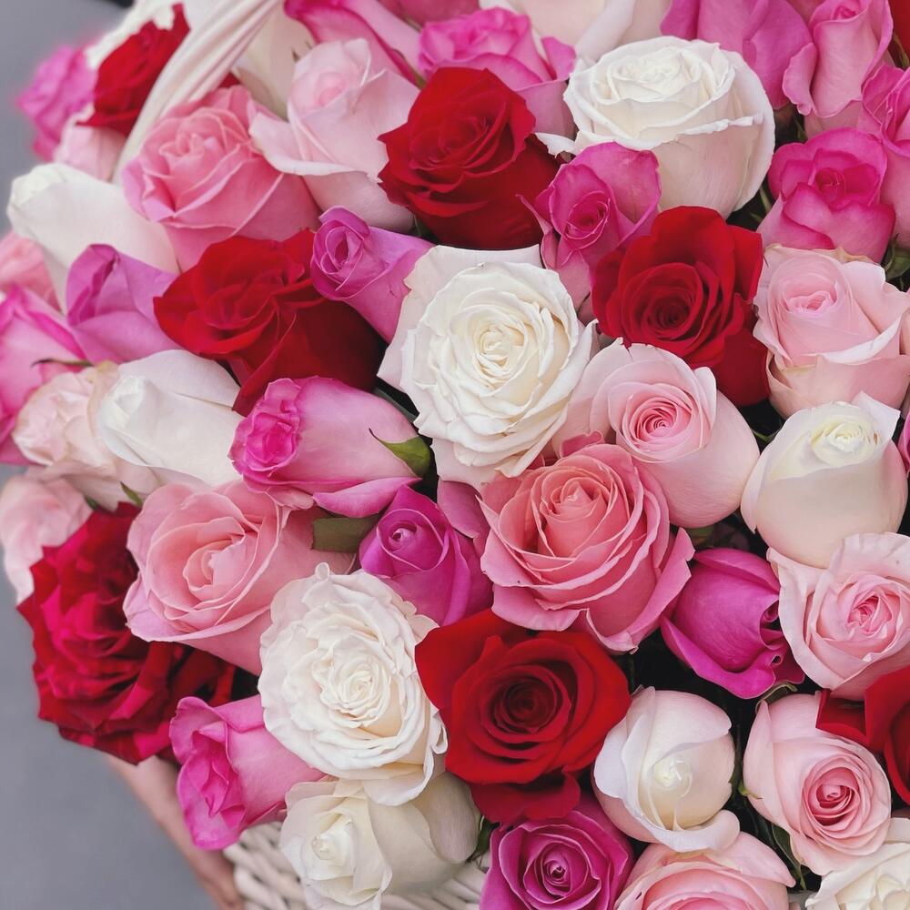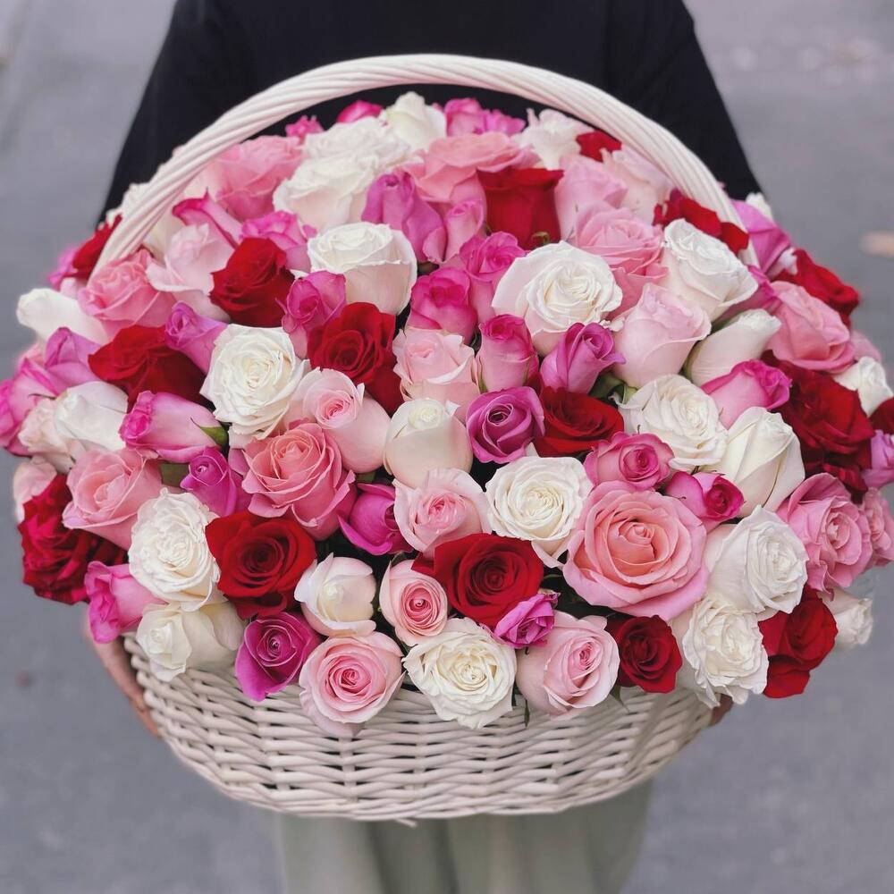 Корзина плетеная – 1 шт.Роза – 151 шт.Оазис флористический – 5 шт.