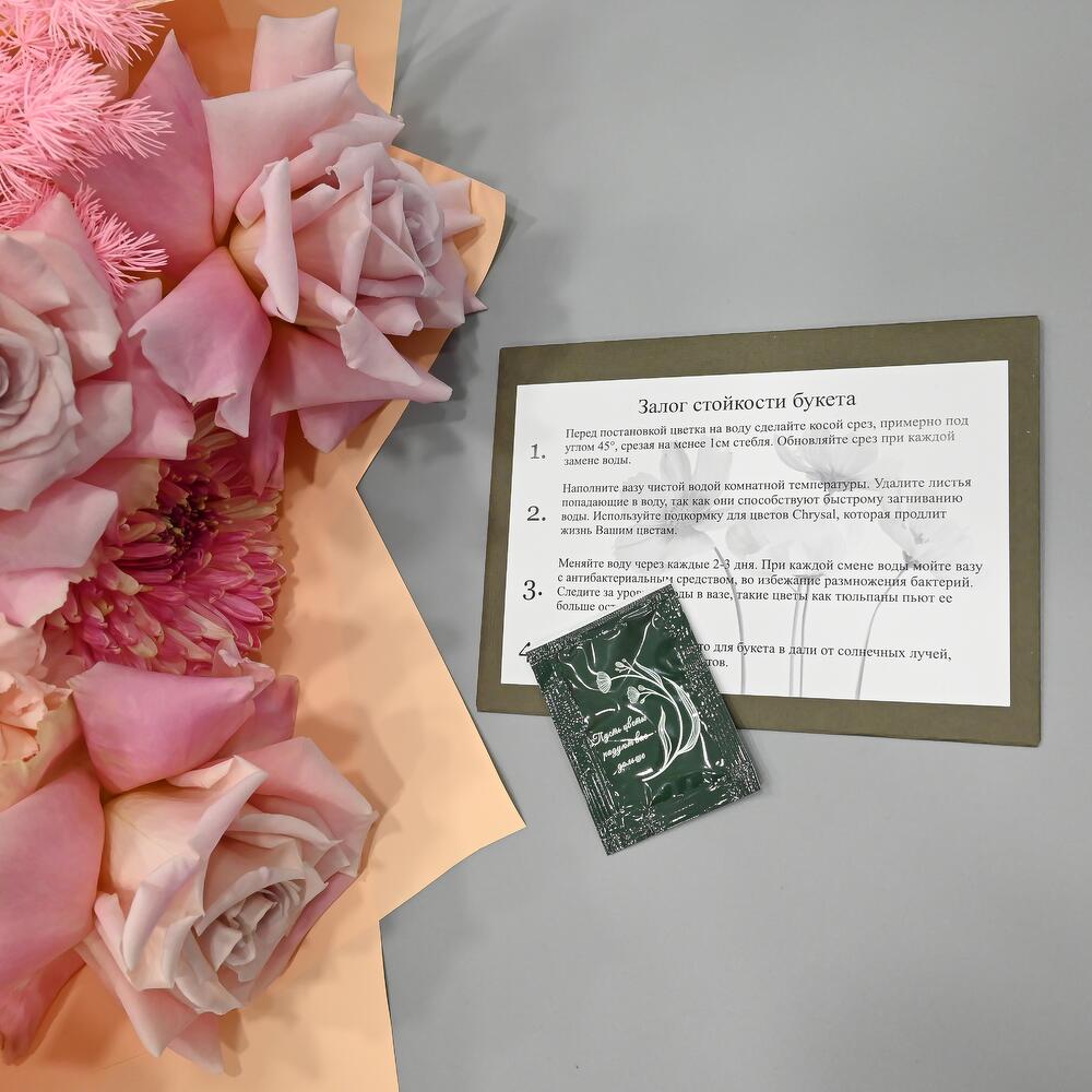 - Сроки возврата: Претензии по качеству букета принимаются в течение 24 часов с момента его получения.