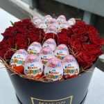 Подарочный набор из красных роз и киндер сюрпризов в фирменной коробке.