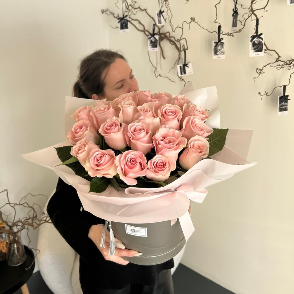 Розы в шляпной коробке - 25 шт