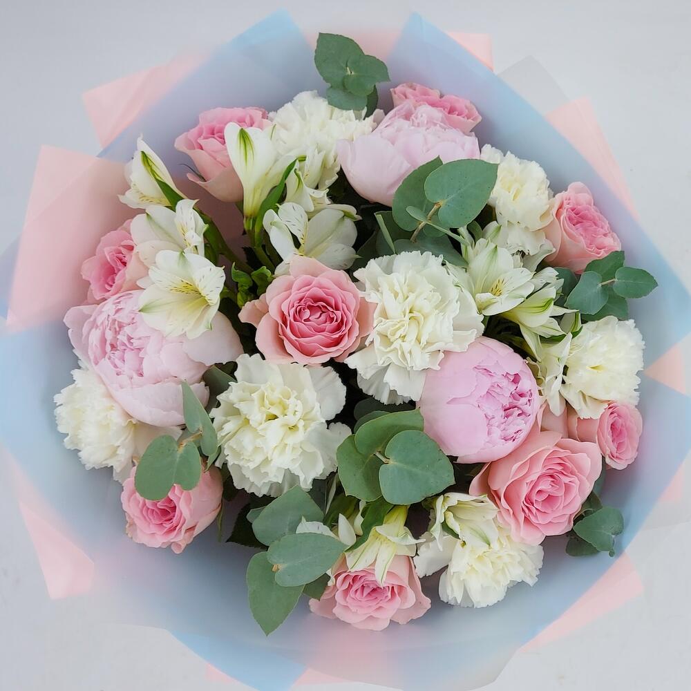 Альстромерия – 3 шт.Пион – 3 шт.Эвкалипт – 7 шт.Роза одноголовая – 9 шт.Упаковка дизайнерская – 1 шт.Пистация – 3 шт.гвоздика сортовая (диантус) – 7 шт.