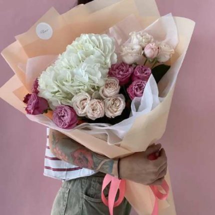 Альстромерии, Гортензии, Кустовые розы, Лизиантусы, Розы, Хризантемы