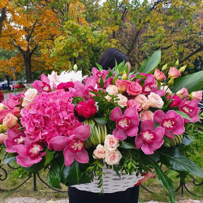 Корзина плетеная – 1 шт.Оазис флористический – 3 шт.Гортензия – 1 шт.Лизиантус – 7 шт.Альстромерия – 6 шт.Роза кустовая – 18 шт.Орхидея Цимбидиум ветка – 1 шт.Зелень – 15 шт.Аралия – 2 шт.Аспидистра – 2 шт.Берграсс пучок – 1 шт.Фисташка – 5 шт.