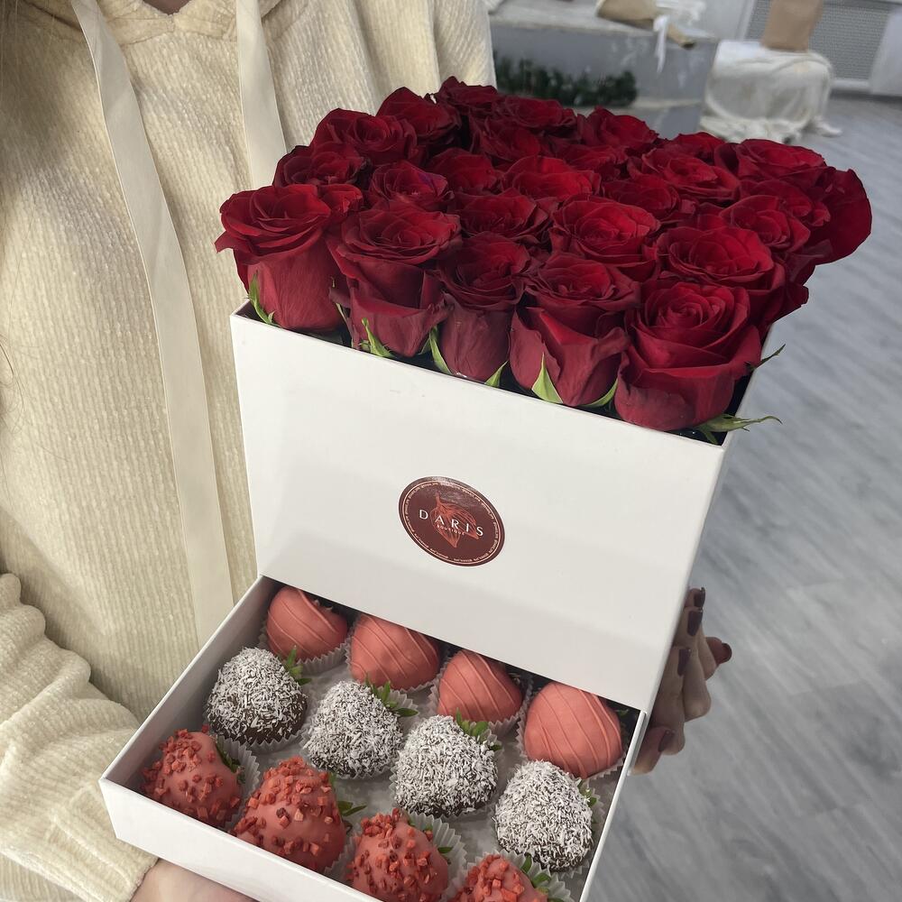 Шкатулка с розами и клубникой в шоколаде