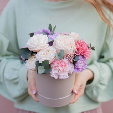 Шляпная коробка со стабилизированными пионовидными розами, ароматным эвкалиптом и натуральным хлопком. Не требует ухода, полива и освещения. Не вянет и не изменяет внешний вид больше года