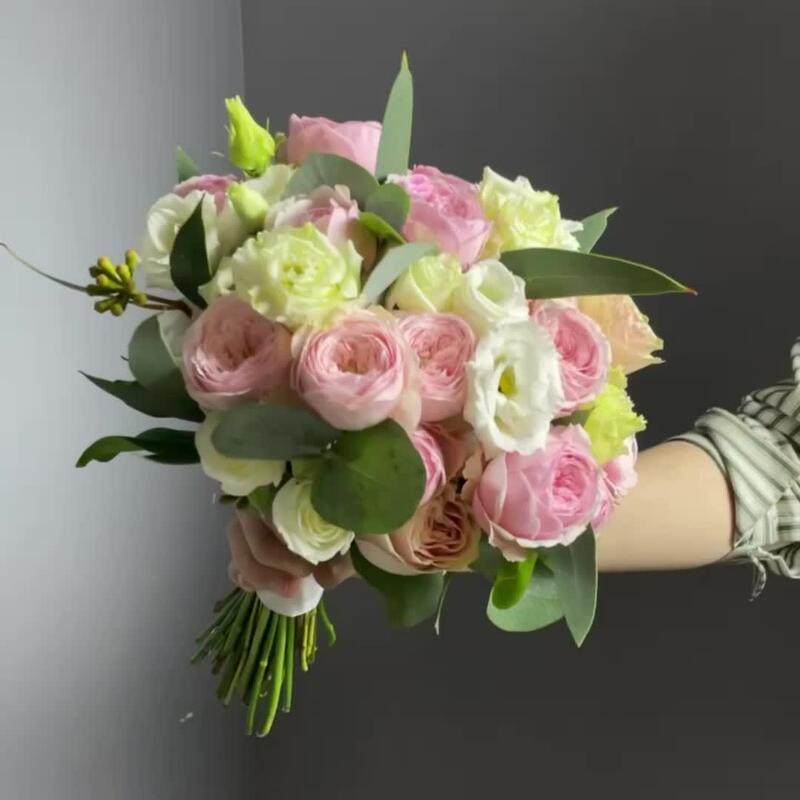 Свадебный букет + бутоньерка, оформленные в атласную ленту.Цветы заказываются индивидуально под каждый букет, поэтому заказ лучше делать минимум за 10 дней до торжества