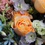Роза пионовидная кустовая – 3 шт.Твидия – 4 шт.Ваксфлауэр – 3 шт.Маттиола – 4 шт.Эвкалипт – 5 шт.Упаковка дизайнерская – 2 шт.Лента атласная – 2 шт.Астранция – 2 шт.Дельфиниум – 3 шт.