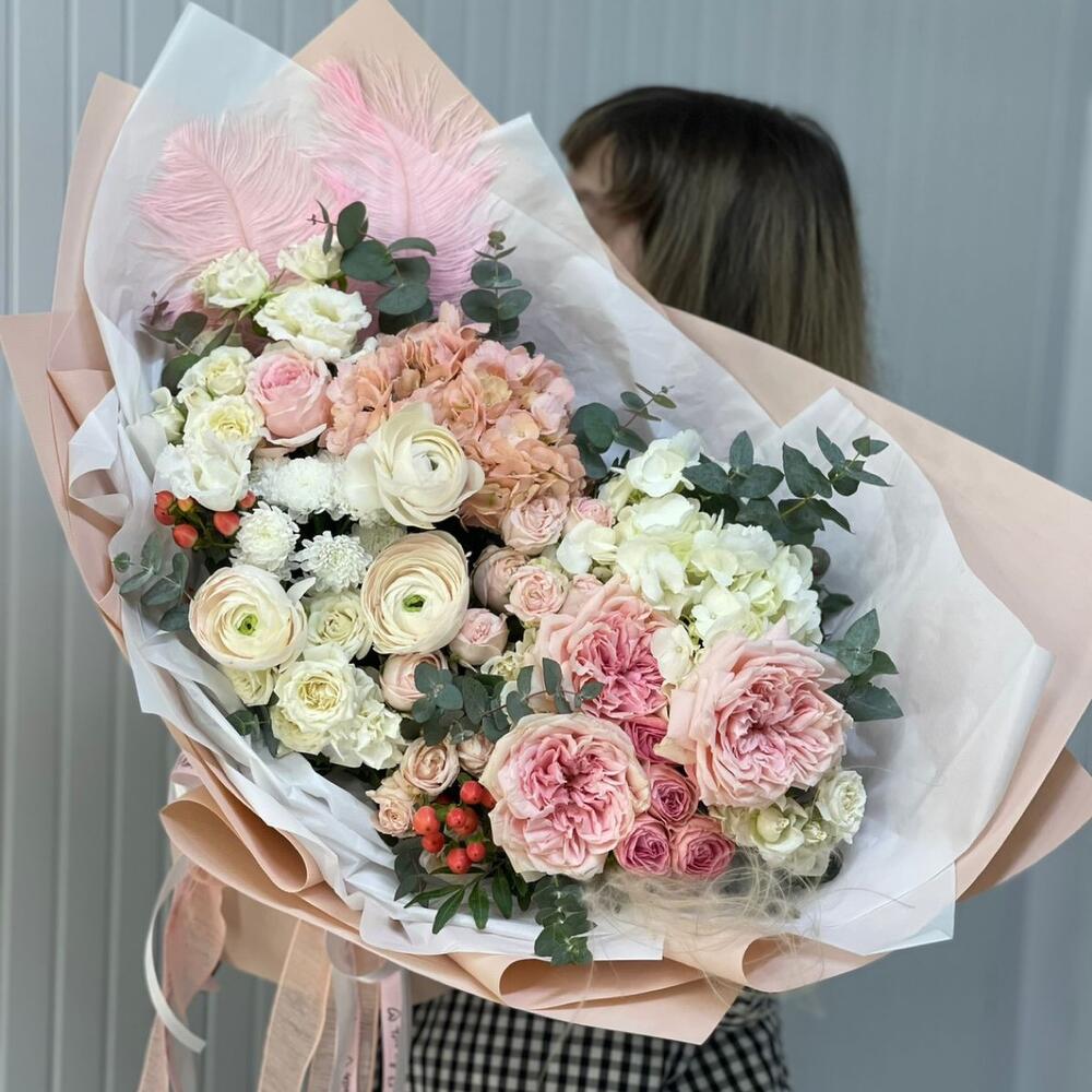 Пионовидная роза – 3 шт.Ранункулюс – 3 шт.Кустовая роза – 5 шт.Хризантема кустовая – 1 шт.Лизиантус – 3 шт.Эвкалипт – 1 шт.Гортензия – 2 шт.перо декоративное – 2 шт.
