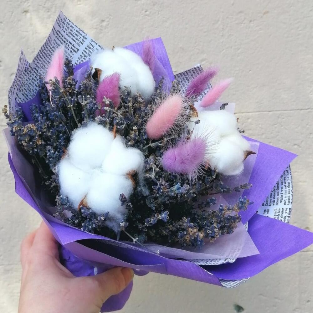 Лаванда (сухоцвет) – 50 шт.Лента – 1 шт.Упаковка – 1 шт.Лагурус – 7 шт.Хлопок натуральный – 3 шт.