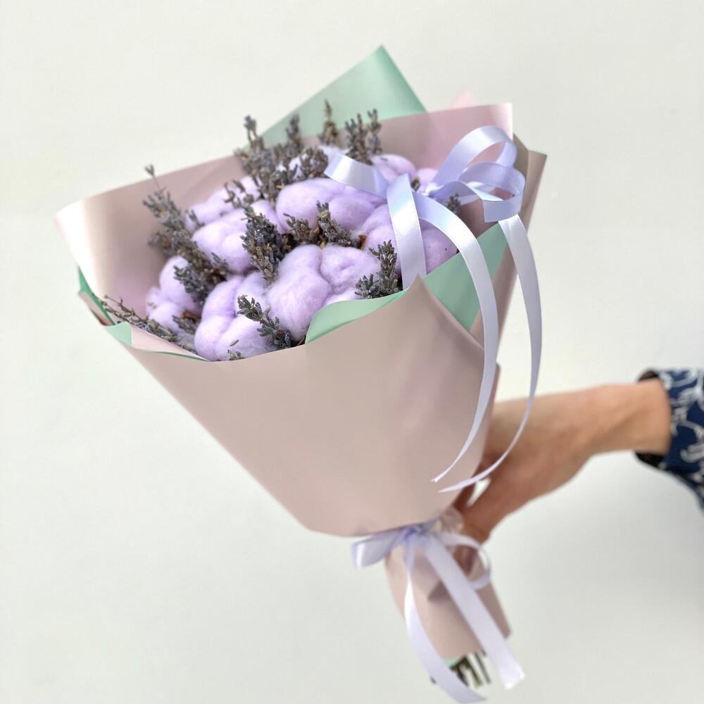 «Лавандовое созвездие» Букет из розы, гвоздики, статица и хлопка