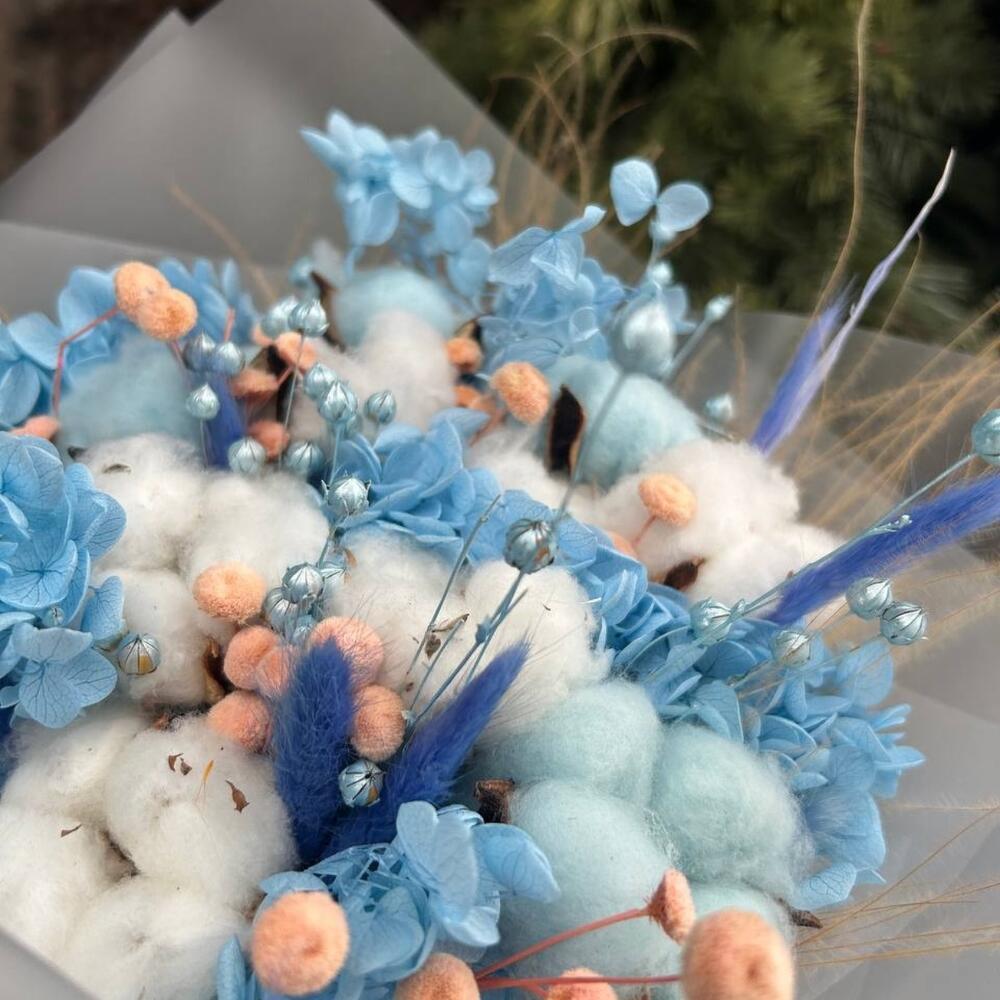 гортензия стабилизированная – 4 шт.Лагурус – 20 шт.Ковыль – 25 шт.ботао – 20 шт.Упаковка дизайнерская – 6 шт.Лента атласная – 1 шт.