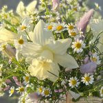 Цветы в коробке с нарциссами , ромашками и лагурусом