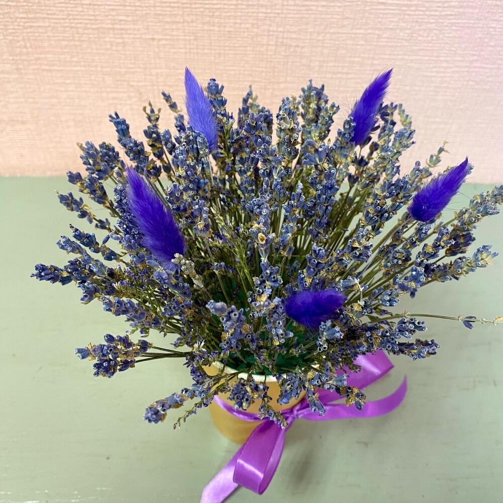 Лаванда (сухоцвет) – 50 шт.Лимониум – 1 шт.Лагурус (сухоцвет) – 5 шт.Стакан флористический – 1 шт.
