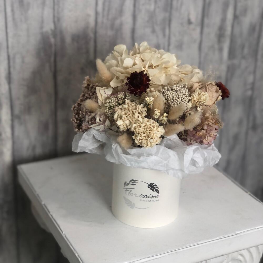 гортензия стабилизированная – 1 шт.лагурус пучок – 1 шт.Сухоцветы – 10 шт.стабилизированный озотамнус – 1 шт.Шляпная коробка – 1 шт.Тишью – 1 шт.