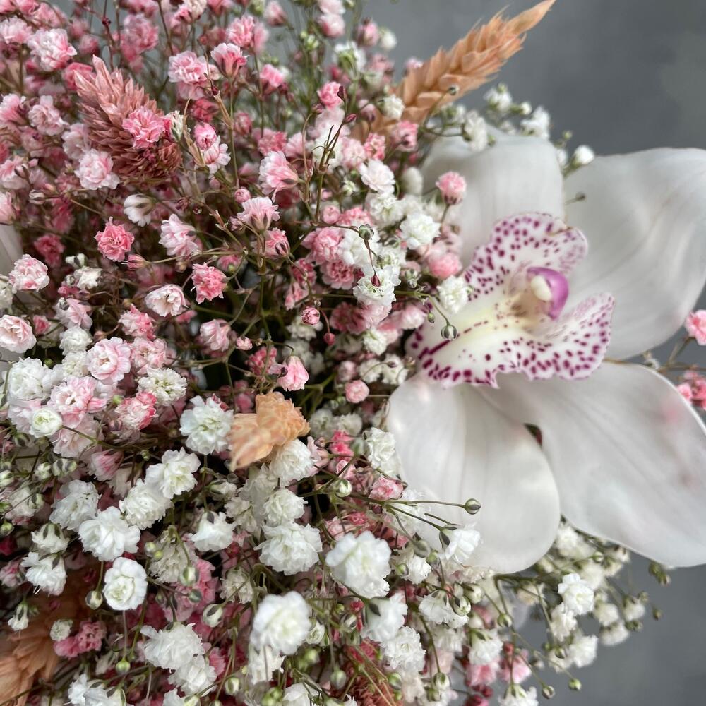 Гипсофила – 6 шт.Коробка – 1 шт.Орхидея цимбидиум микс – 3 шт.Лагурус (сухоцвет) – 11 шт.Пшеница (сухоцвет) – 9 шт.