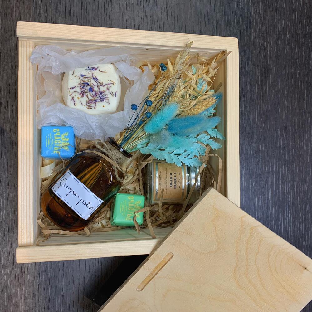 Ящик деревянный ручной работы – 1 шт.Ваза стекло – 1 шт.букет из сухоцветов – 1 шт.свеча banca home в ассортименте – 1 шт.бомбочка для ванной ручной работы с натуральными маслами – 1 шт.конфеты счастье 50г – 2 шт.