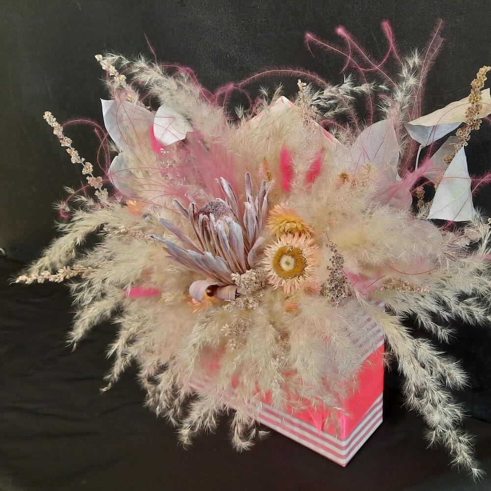 Целозия – 1 шт.Лента атласная – 6 шт.Коробка шляпная – 1 шт.Ковыль – 2 шт.Лагурус – 6 шт.Оазис флористический – 1 шт.Бессмертник – 6 шт.кортадерия – 1 шт.протея сухоцвет – 1 шт.