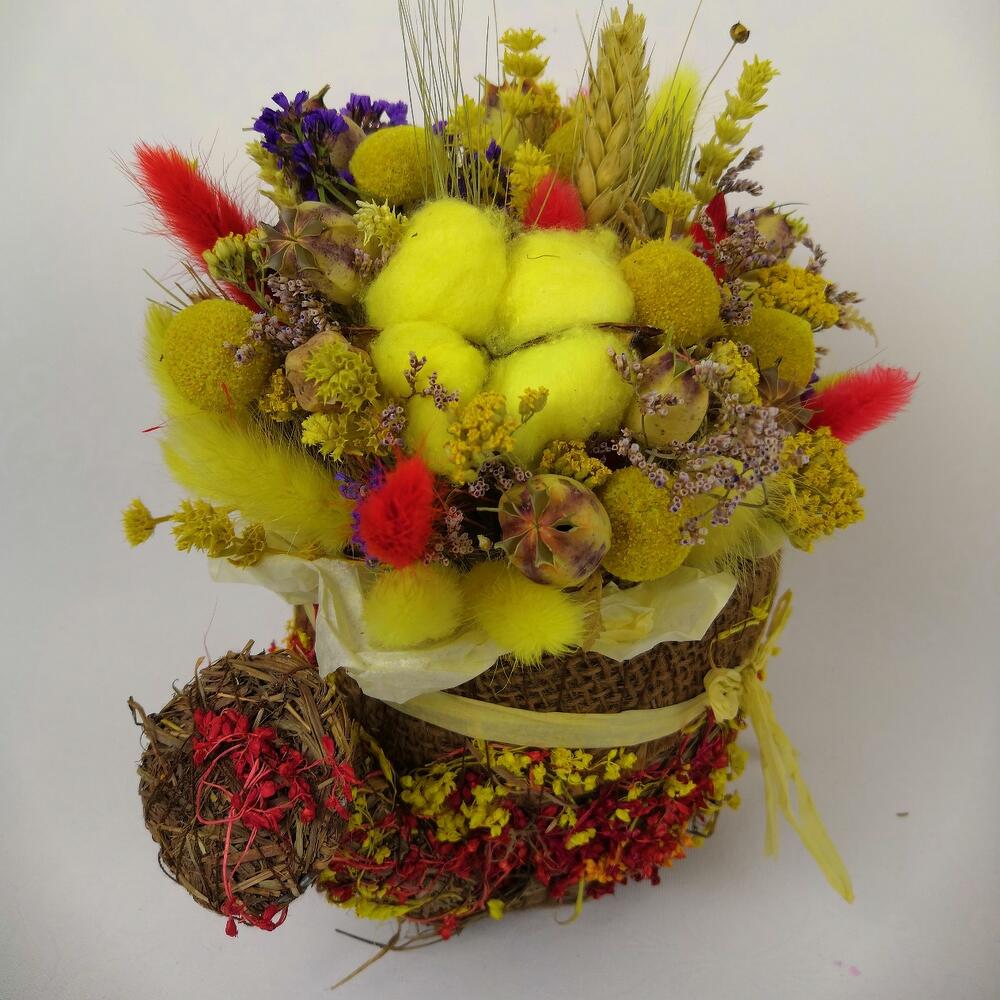 Кашпо натуральное – 1 шт.Оазис флористический – 1 шт.Краспедия желтая – 7 шт.сухоцвет желтый – 15 шт.Статица – 1 шт.Лагурус (сухоцвет) – 25 шт.Хлопок – 1 шт.Нигелла сухоцвет – 9 шт.лимониум сухоцвет – 1 шт.Пшеница (сухоцвет) – 5 шт.Папоротник – 1 шт.