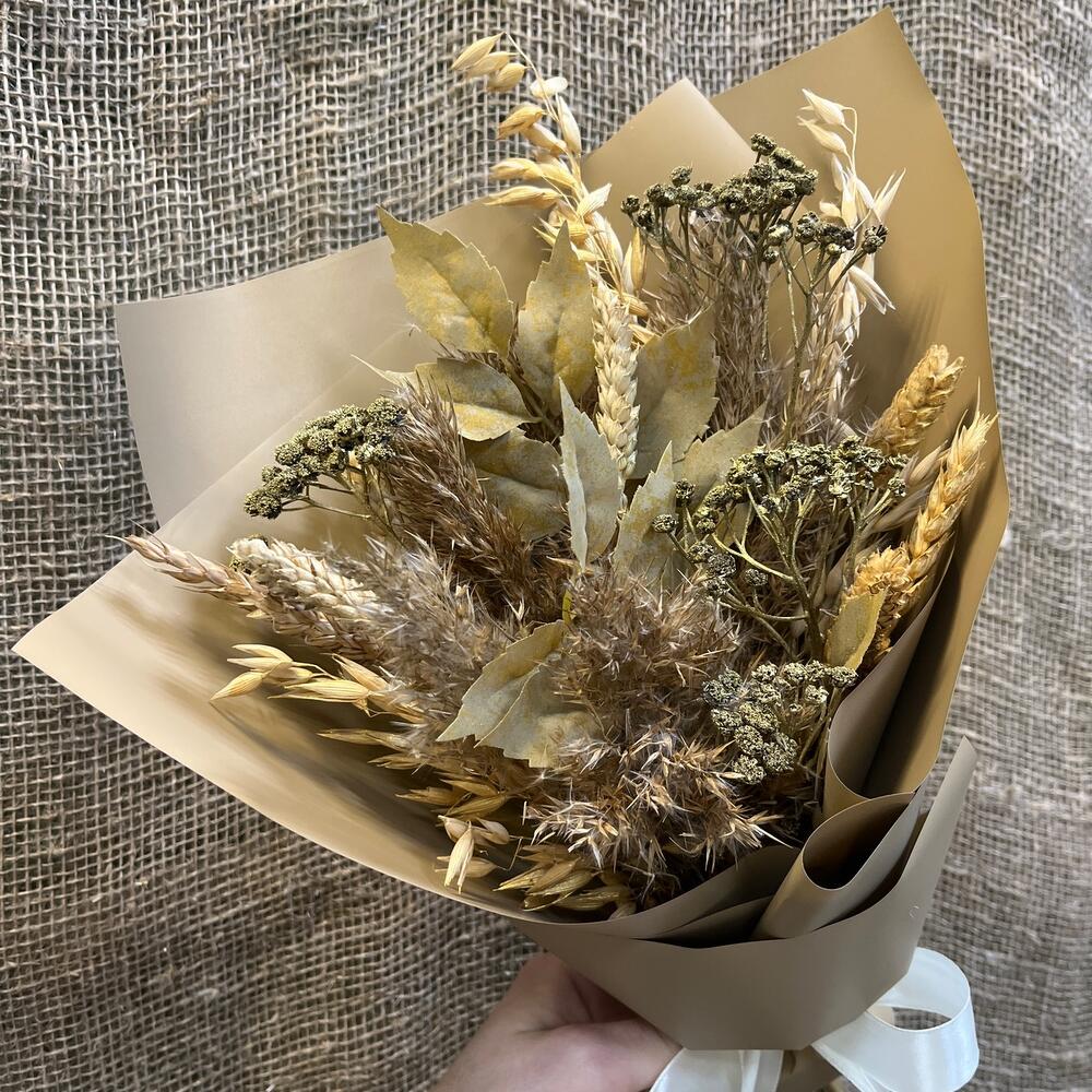 Лента атласная – 1 шт.Пшеница – 10 шт.Овес – 5 шт.Корейская упаковка – 1 шт.тысячелистник сухоцвет – 3 шт.искуственные листья – 3 шт.злак метелка – 5 шт.