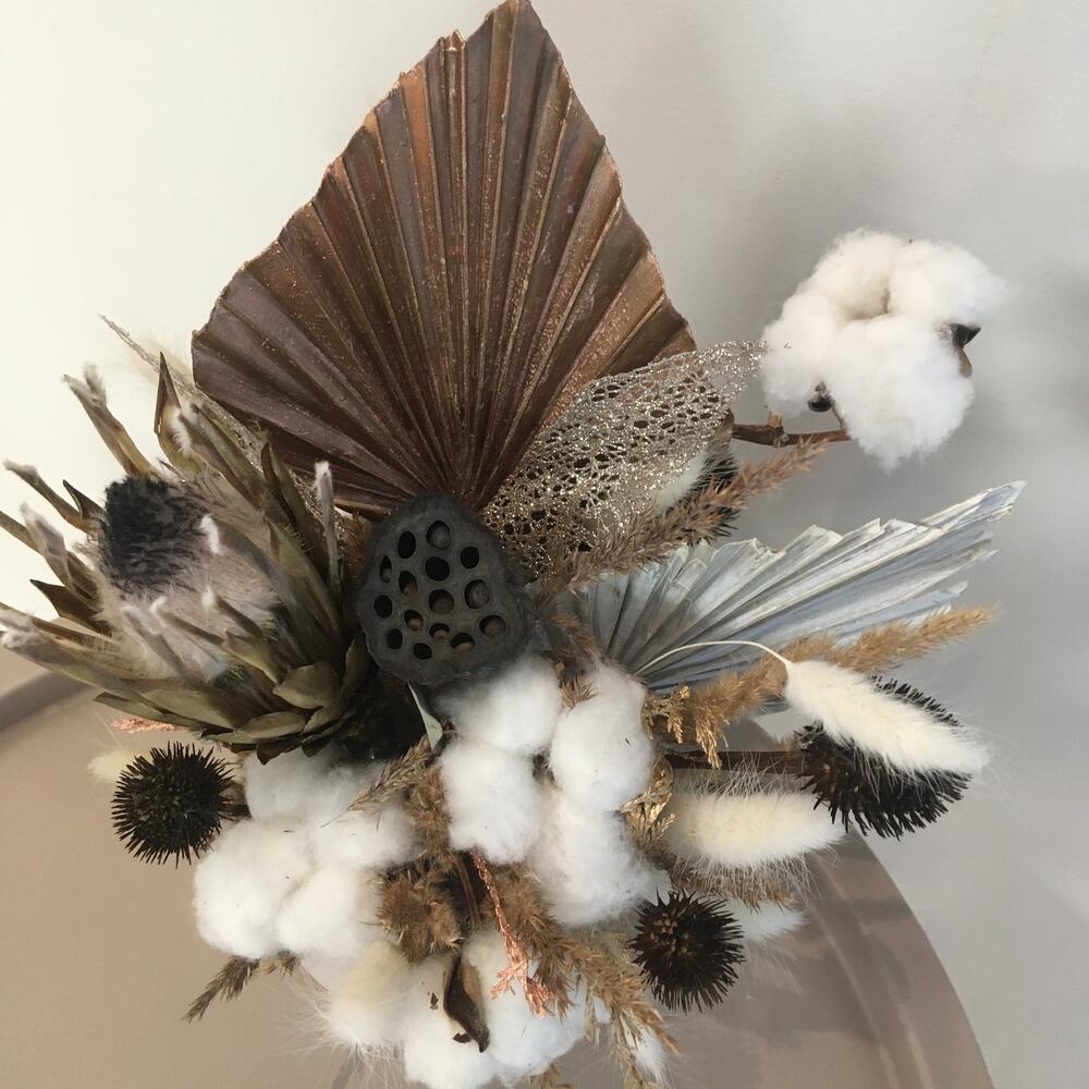 Хлопок натуральный – 5 шт.Лагурус (сухоцвет) – 15 шт.камыш – 11 шт.Протея – 1 шт.пальмы сухоцвет – 2 шт.Лотос сухой – 1 шт.Кашпо керамическое – 1 шт.