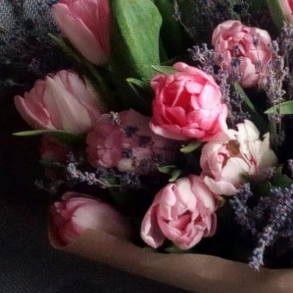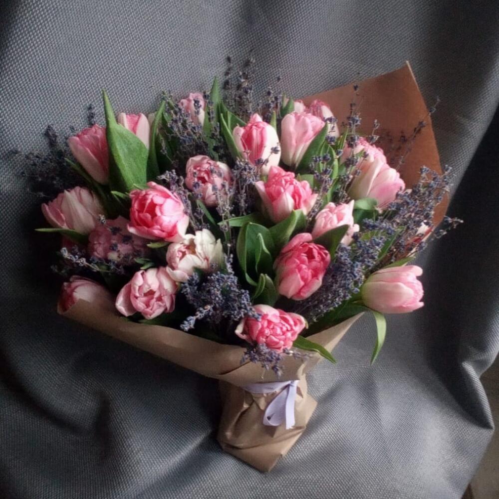 Тюльпан пионовидный – 25 шт.Лаванда (сухоцвет) – 175 шт.Крафт упаковка – 1 шт.Лента атласная – 1 шт.Пакет подарочный – 1 шт.