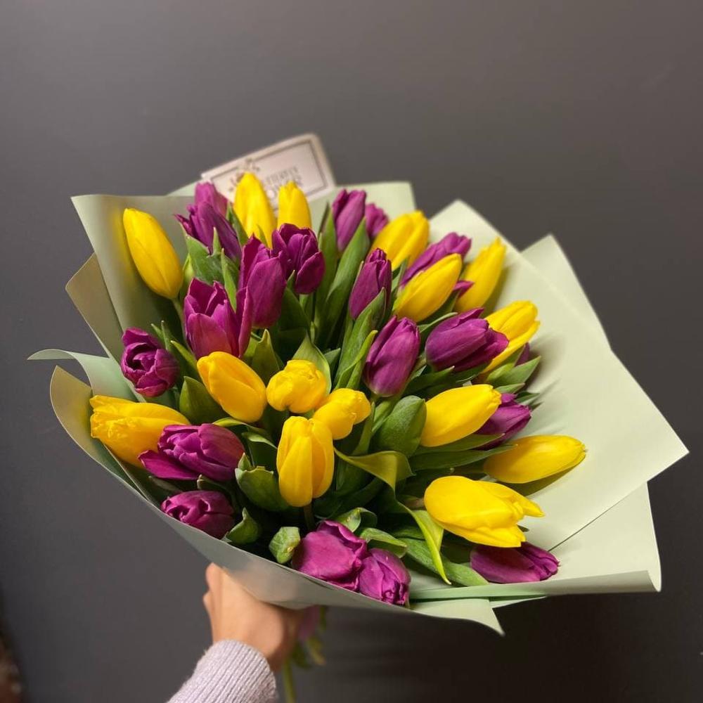 Букет из 35 желтых и фиолетовых тюльпанов “Элбург”