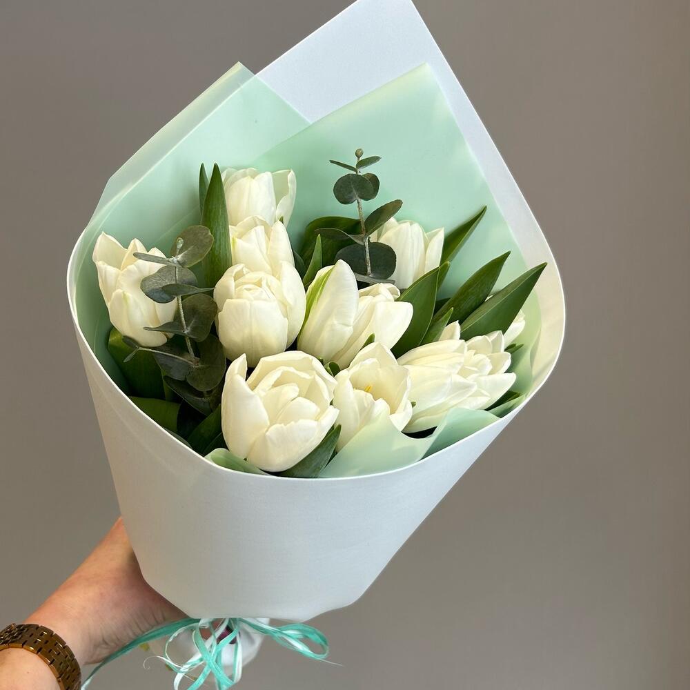 Букет из нежных белых тюльпанов с веточками эвкалипта