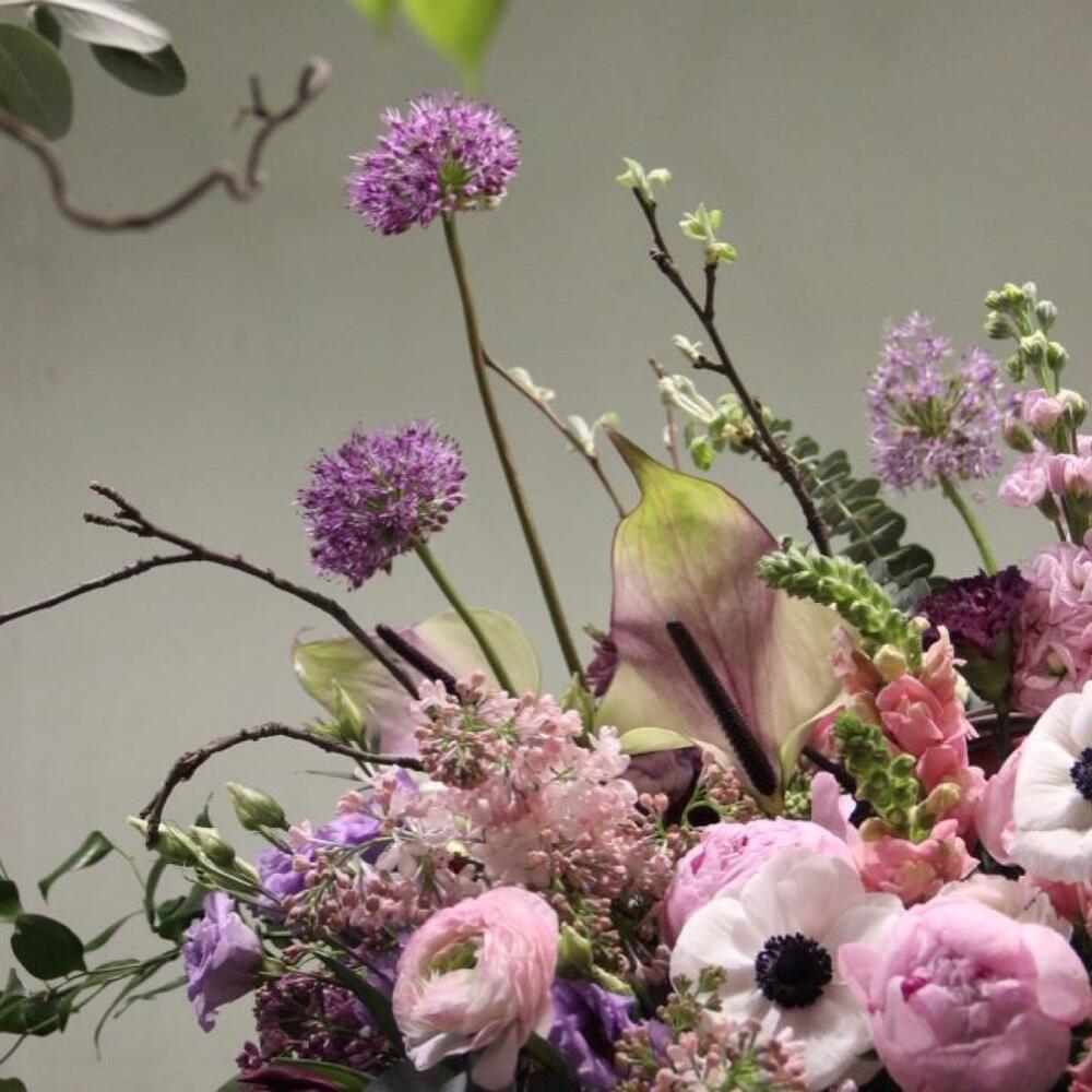 Анемон – 3 шт.Антуриум – 2 шт.Дельфиниум – 2 шт.Корзина – 1 шт.Лизиантус – 7 шт.Маттиола – 11 шт.Пион – 5 шт.Сирень – 3 шт.Хедера – 5 шт.Эвкалипт – 11 шт.Ранункулюс – 3 шт.Аллиум – 2 шт.Львиный зев – 3 шт.Тюльпан сортовой – 11 шт.Молюцелла – 2 шт.Ветви – 3 шт.
